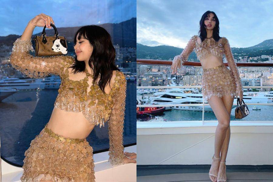 Lisa juga melengkapi dan memaksimalkan penampilannya mengenakan tas Louis Vuitton. Tas ini tampak unik dengan motif anak anjing. Selain itu, Lisa juga mengenakan strappy heels berwarna nude.