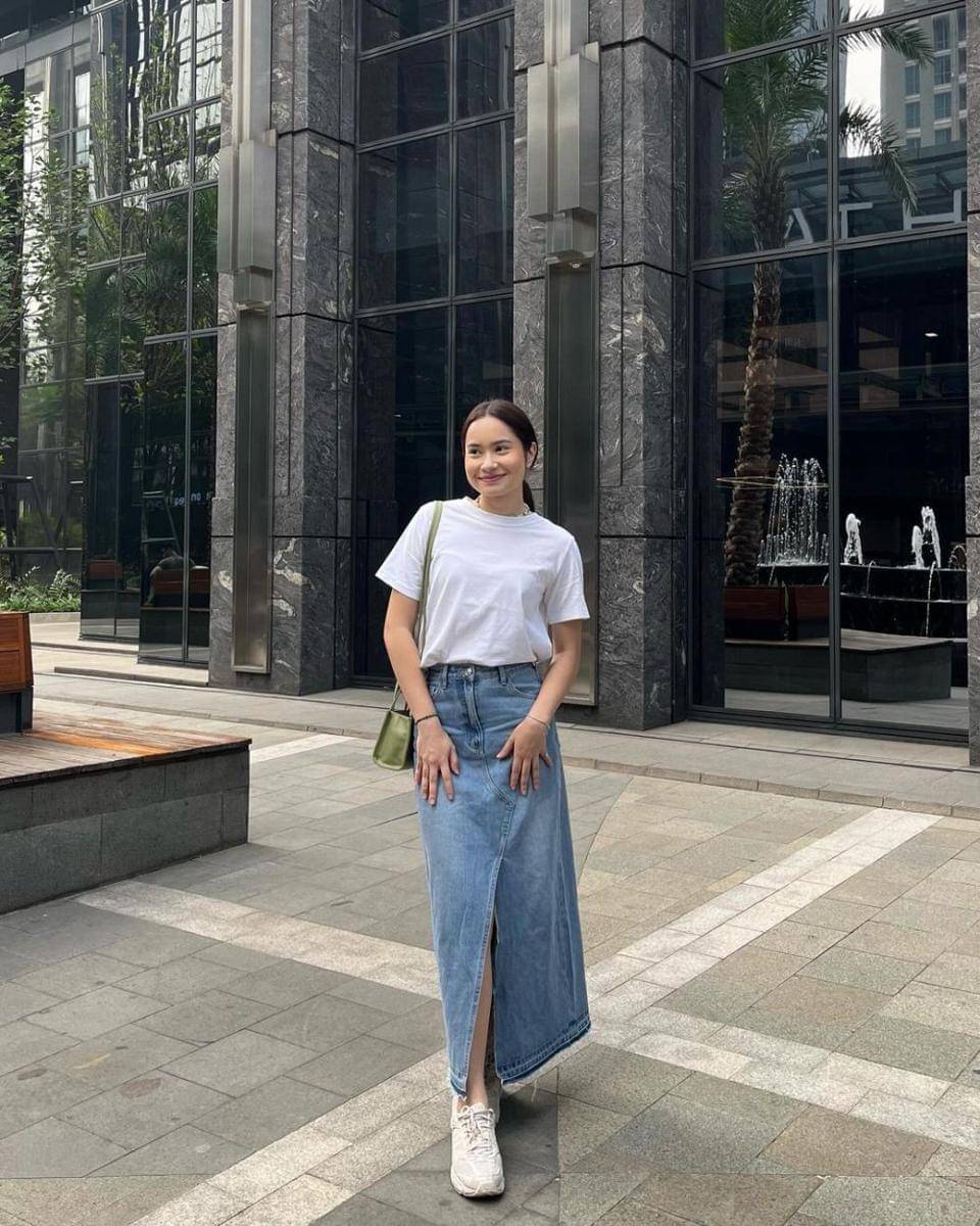 8. Effortless style yang akan tetap bikin kamu tampil flawless adalah paduan kaus putih dan rok denim dengan aksen slit. Berminat mencobanya?