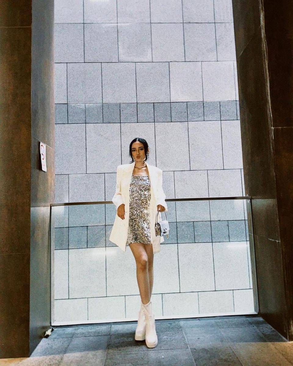 1. Syifa Hadju padukan mini dress silver dengan balutan blazer oversize putih, semakin stunning dengan alas sepatu boots putih