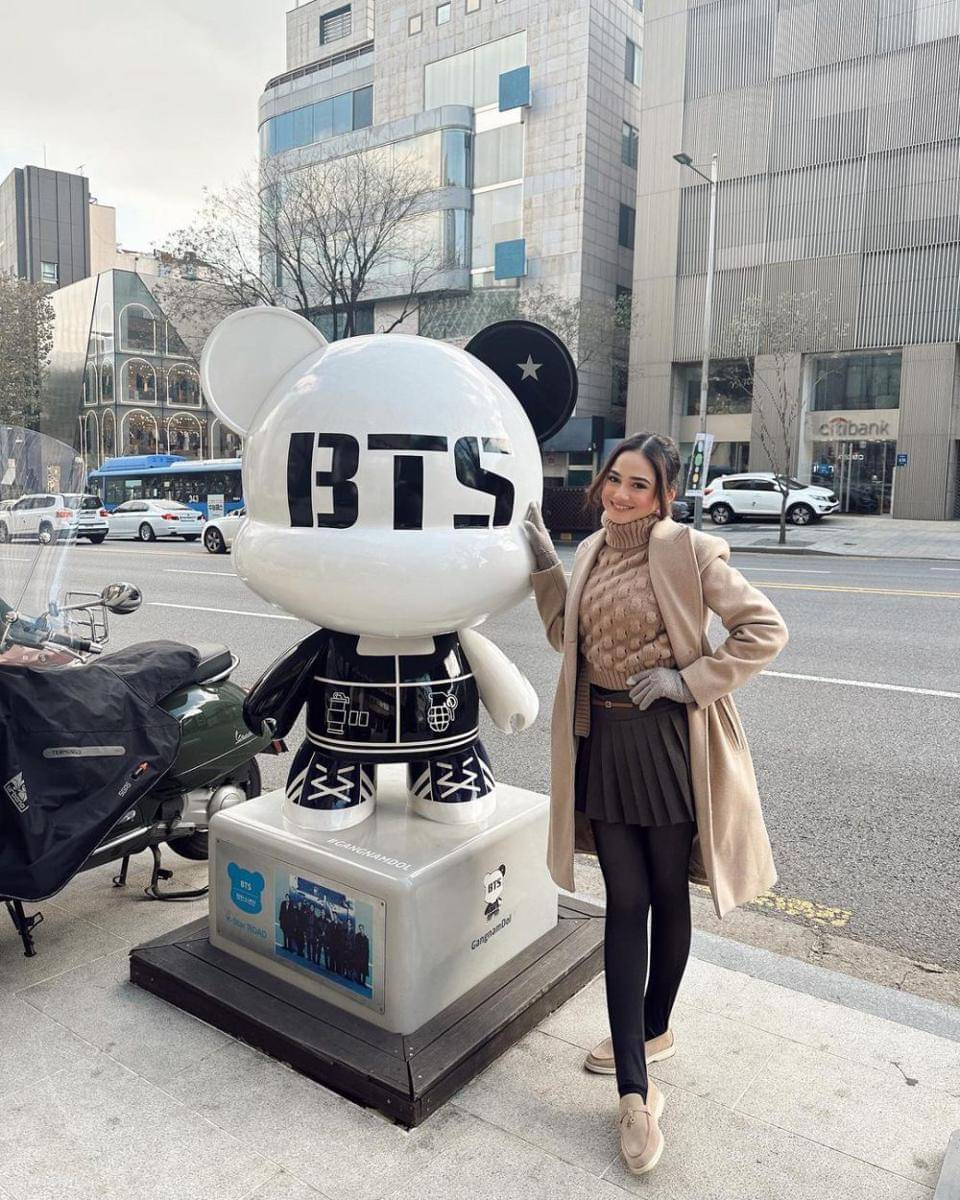 8. Memakai sweater knit dan long blazer cokelat, Syifa memilih pleated skirt dan leggings hitam sebagai bawahan. Cocok buat outfit traveling, nih!