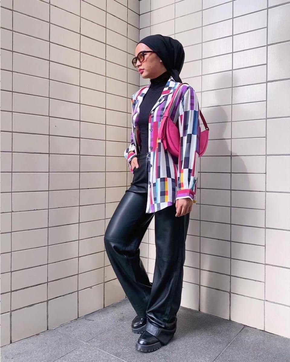 6. Ingin menggabungkan kesan boyish, edgy, dan girly dalam satu outfit? Padukan saja inner turtleneck, leather pants, blazer bermotif geometrik, dan shoulder bag
