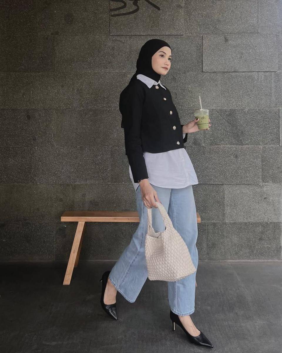 4. Mau gaya casual yang gak boring? Bagaimana kalau memadukan kemeja putih bersama sweater hitam dan straight jeans seperti ini?