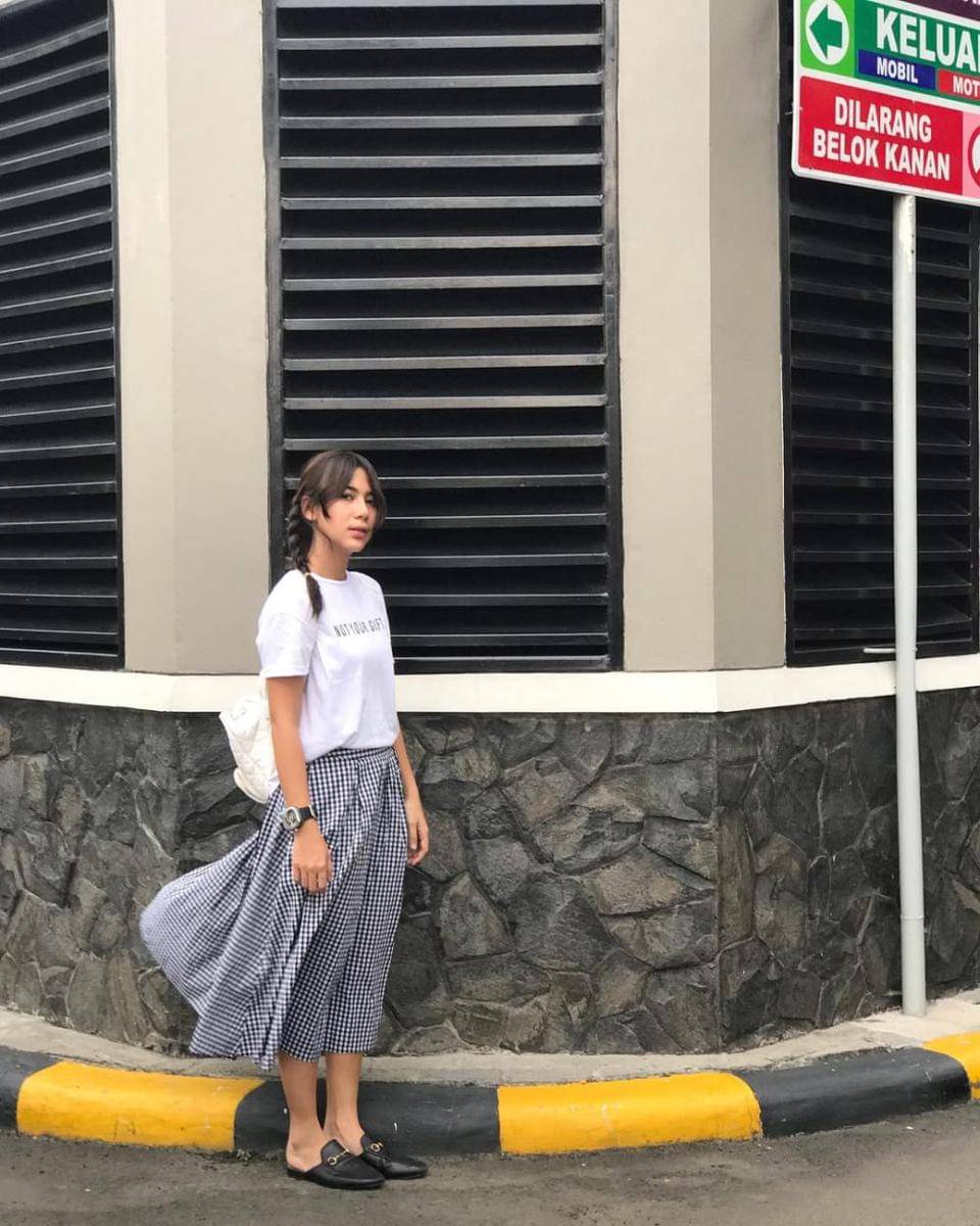 3. Kalau bingung ingin pakai busana apa buat ngampus, perpaduan midi skirt motif gingham, kaus warna putih, dan sandal mules bisa jadi opsi