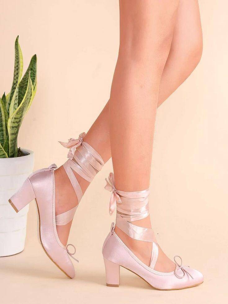 5. Tren pita coquette juga memiliki sentuhan balletcore, seperti model block heels warna pink pastel dengan lilitan pita