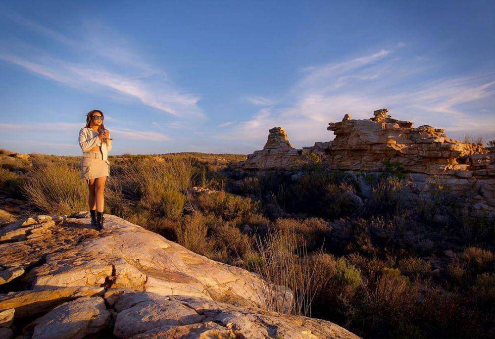 8. Dress warna krem adalah pilihan yang sangat tepat jika berfoto dengan tema safari di alam bebas
