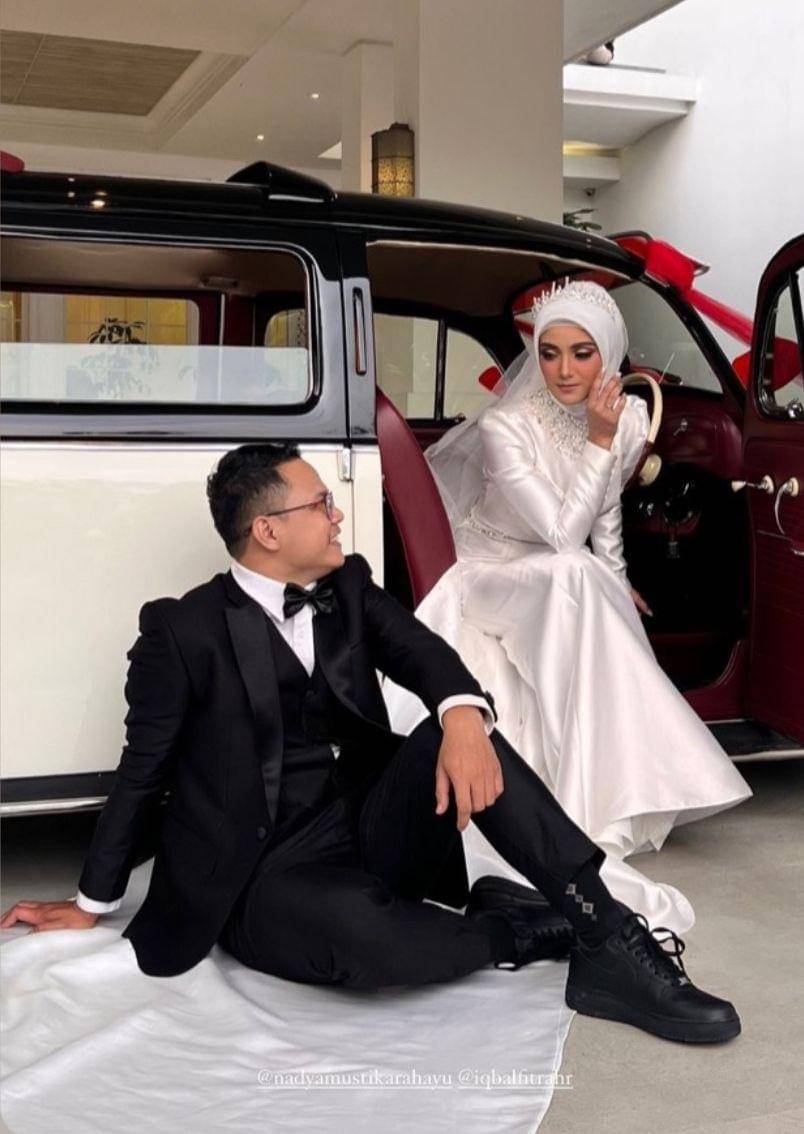 Nadya Mustika dan Iqbal Rosadi menggelar resepsi di hari yang sama setelah akad nikah. Kalau momen akad bertema tradisional, mantan istri Rizky DA memilih konsep pernikahan internasional modern saat resepsi.