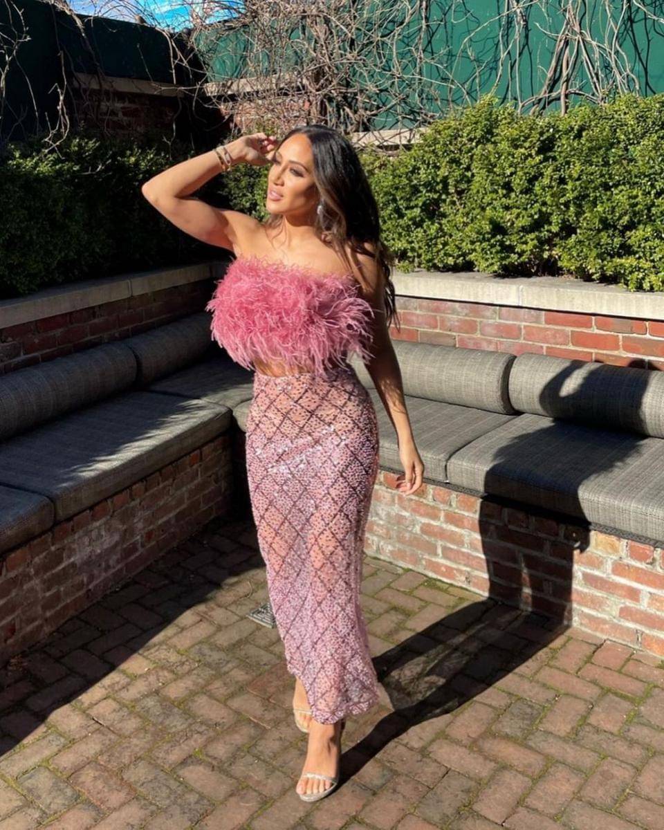 5. Melissa Gorga tampil menawan dengan style yang gemerlapan. Atasannya beraksen feather dan rok sequin warna pink yang super feminin!