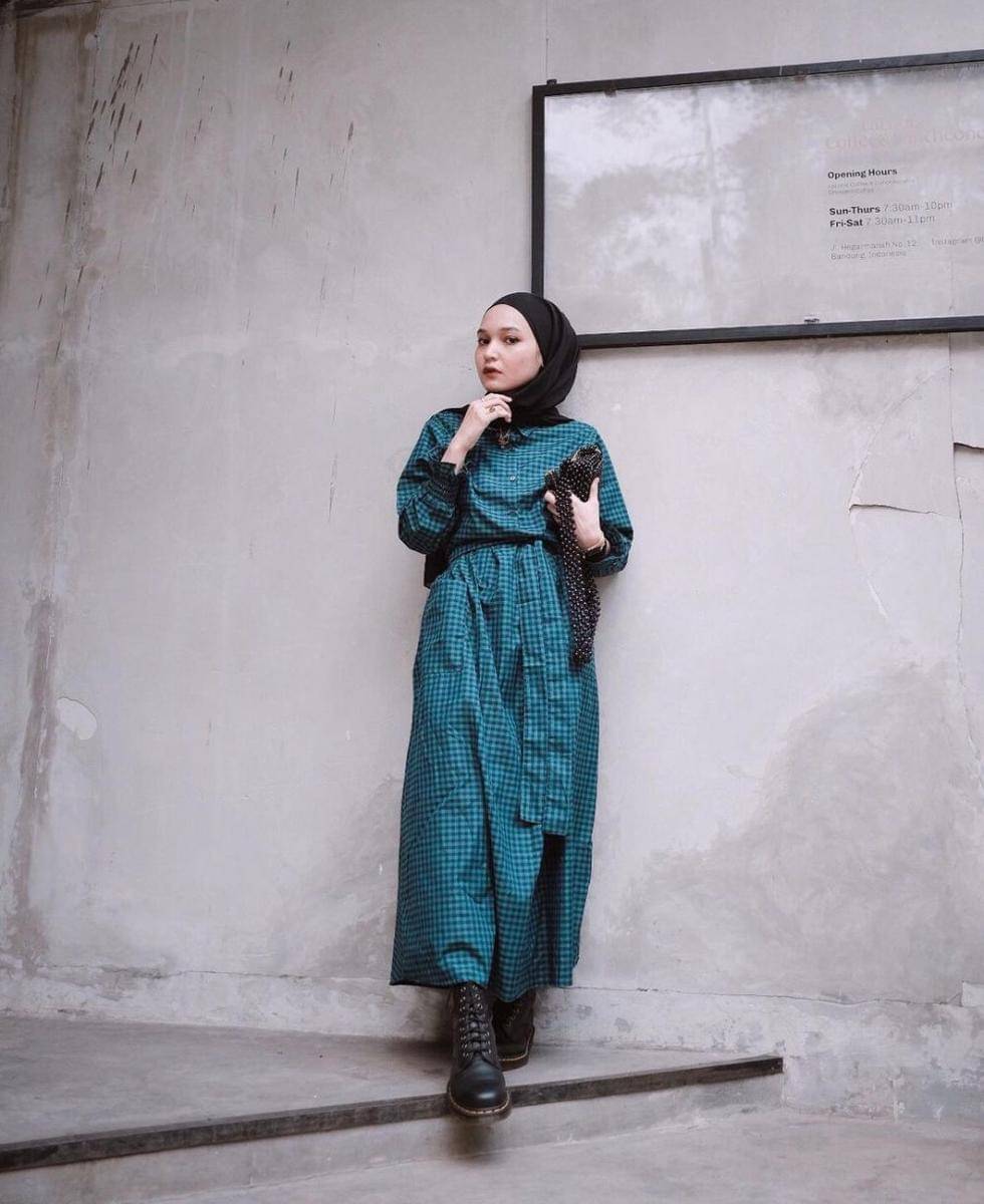 11. Gunakan dress motif tartan berwarna green bottle, padukan dengan hijab pashmina hitam serta boots, trendi abis buat OOTD!
