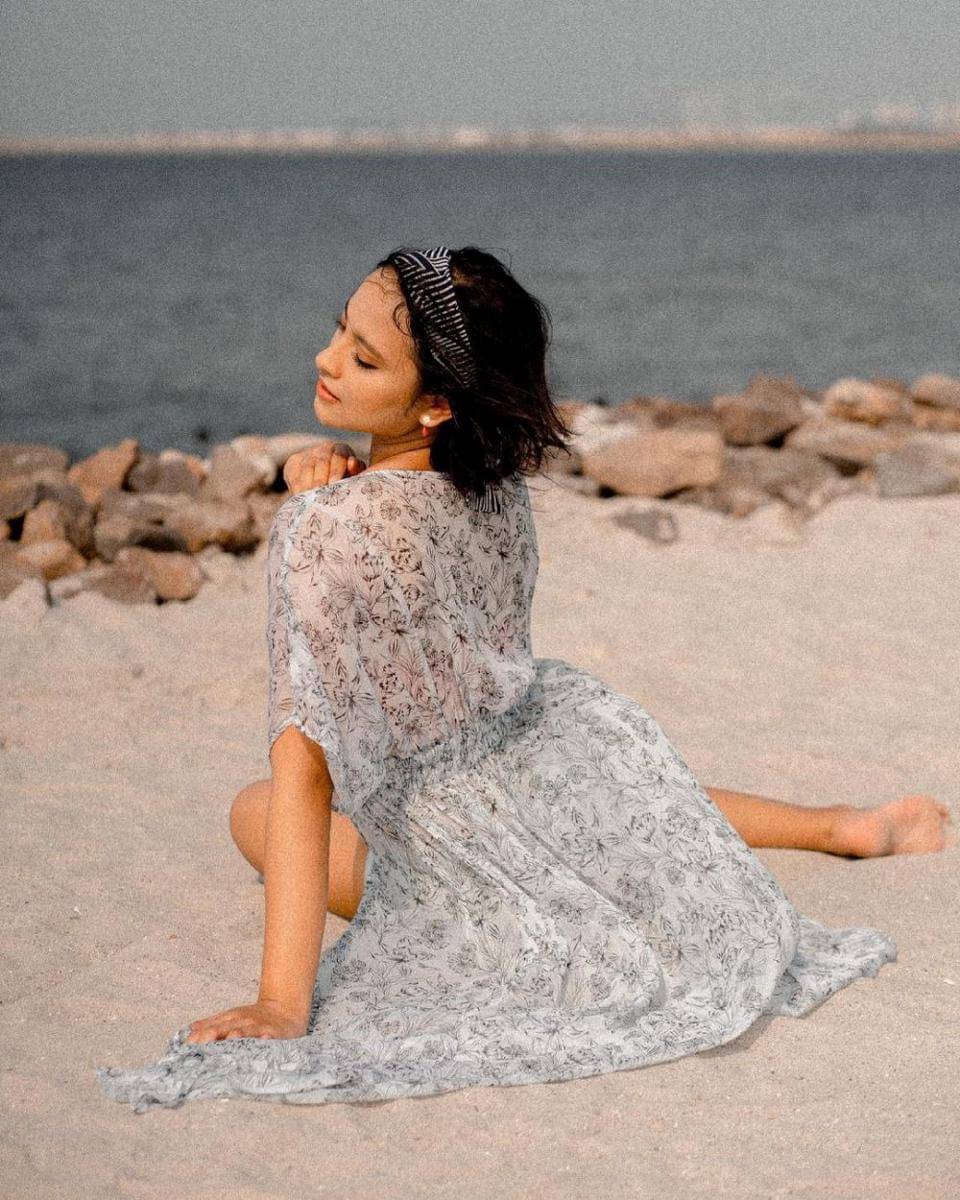 9. Lakukan sesi pemotretan di pinggir pantai sambil piknik, wanita yang memiliki hobi traveling ini makin menawan dengan gaun kuning yang ia kenakan