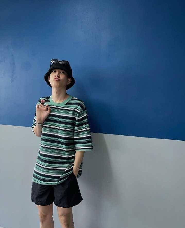 5. Paduan antara celana pendek hitam dengan shirt bermotif garis, serta tambahkan bucket hat sukses bikin kamu jadi terlihat kekinian namun tetap simpel