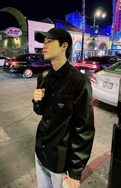 4. Untuk menikmati suasana malam di Los Angeles, Suho memilih kemeja hitam Prada yang disempurnakan dengan baseball cap dan tas selempang senada