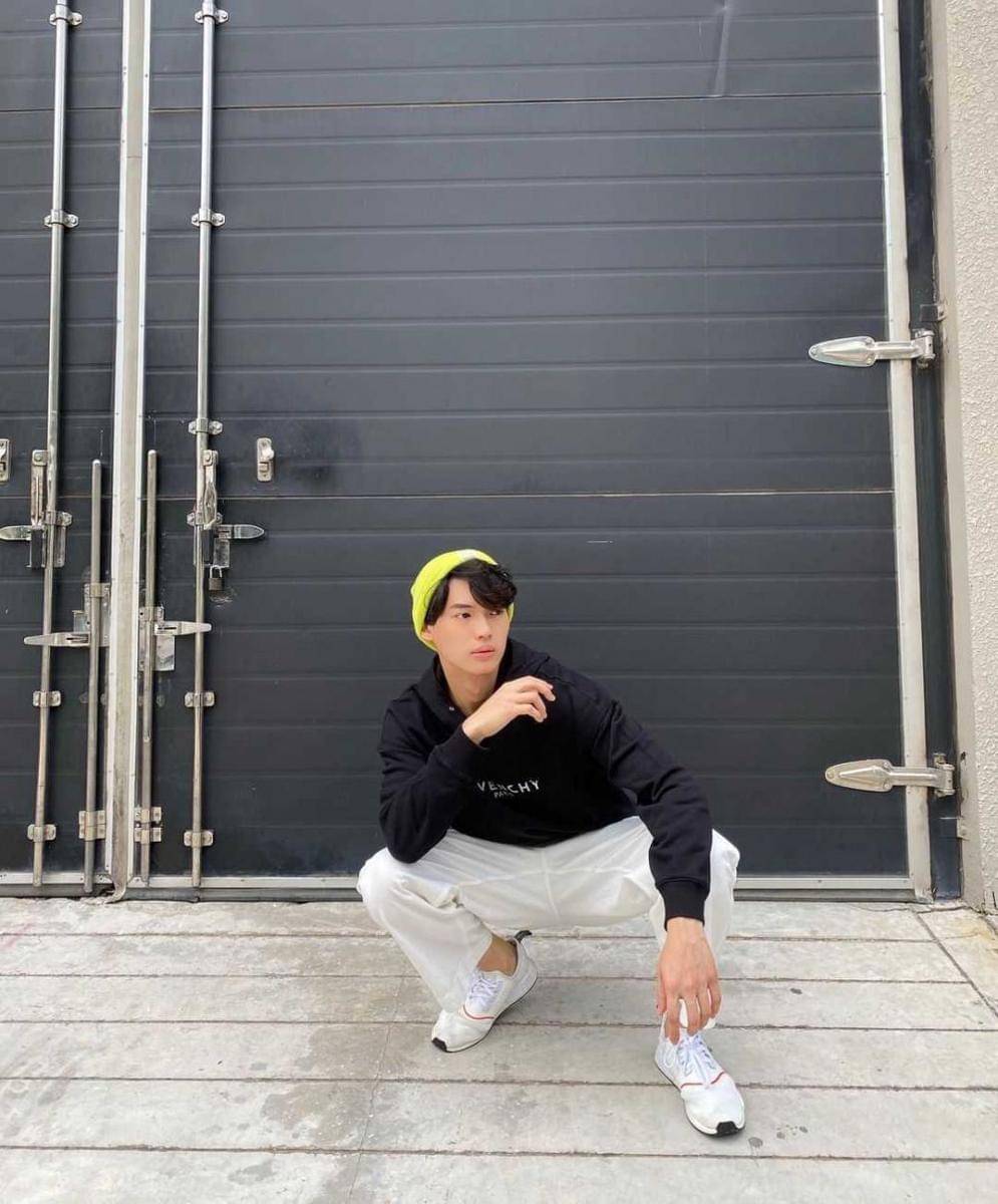 10. Gaya super playful ala Win Metawin cukup dengan padu padan black hoodie, white pants dan white sneakers serta tambahan beanie hat yang nyentrik berwarna lime green