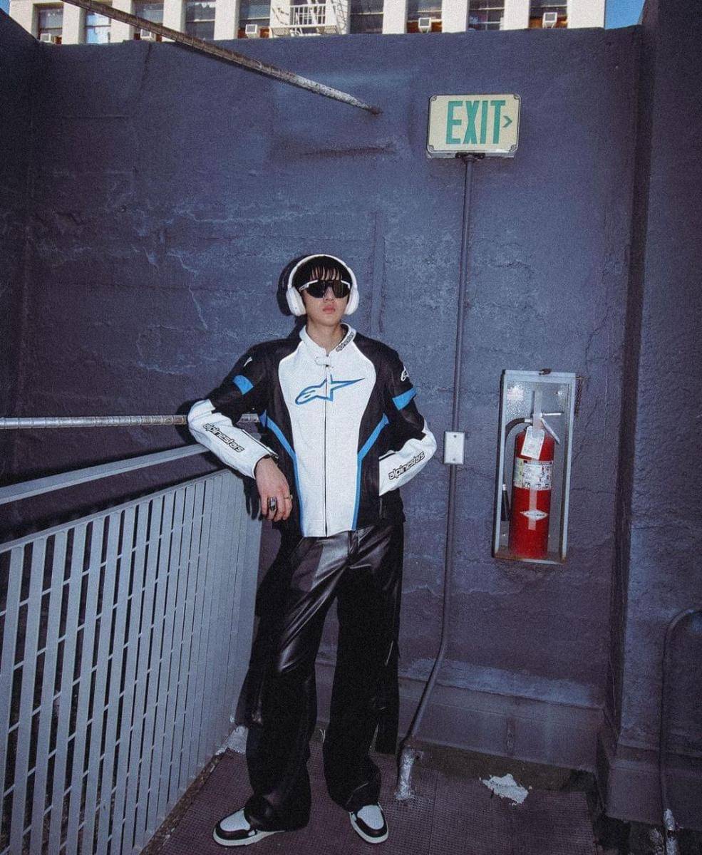5. Super chic, Warren pamerkan leather racing jacket, leather cargo pants, sneakers, sunglasses, dan aksesori headphones yang jadi andalan para Gen Z!