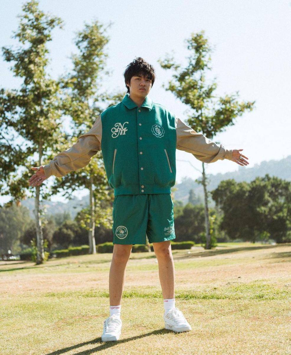 1. Modis, Warren kenakan setelan varsity jacket dan short pants, mid-calf socks, serta sneakers. Pilihan warna hijau bikin look makin fresh!