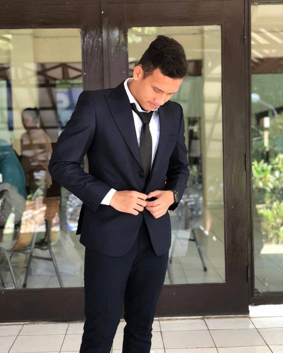 3. Egy begitu gagah mengenakan setelan jas berwarna hitam di acara pelepasan siswa SMA