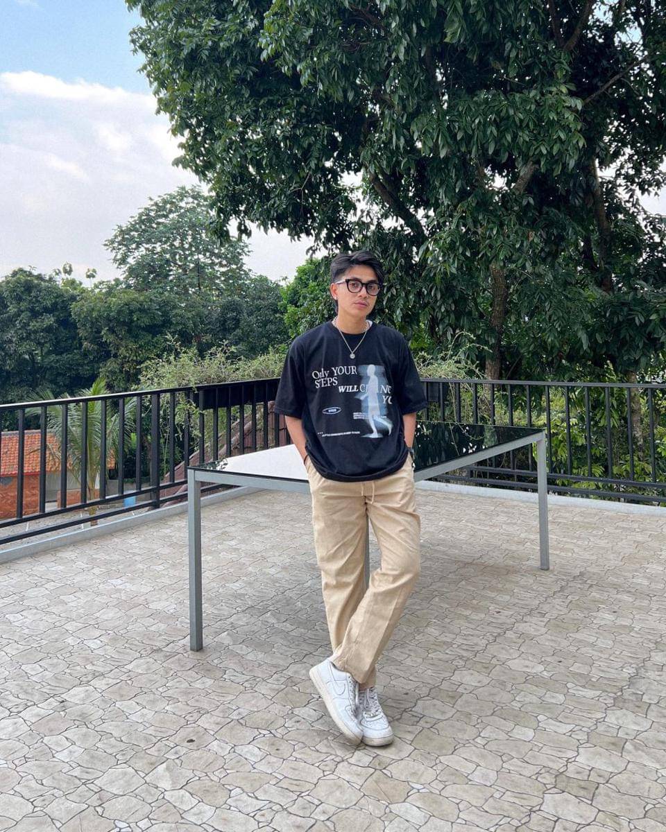 3. Bergaya kasual santai, Fazmi tampil dalam balutan printed t-shirt hitam dengan bawahan slim straight pants beige, dan white sneakers