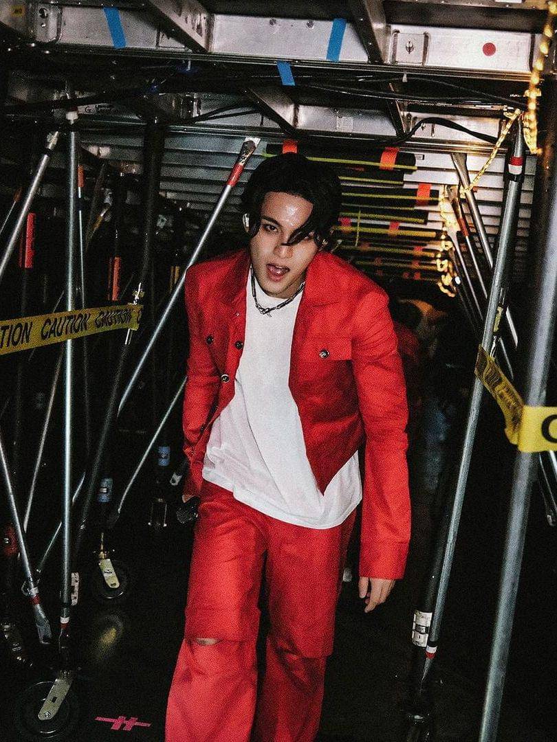 7. Outfit leather jacket aksen merah juga sukses dipamerkan oleh Hyungwon MONSTA X. Terdiri dari t-shirt, wide leg pants, dan pantofel senada