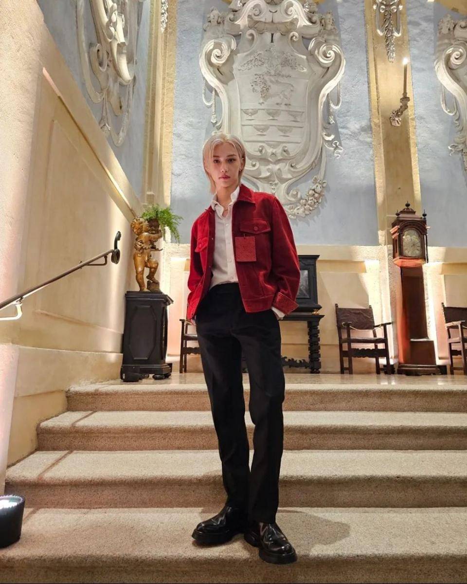 9. Look minimalis, Felix STRAY KIDS pakai kemeja putih, suede jacket merah, fit regular trousers, dan leather boots. Agustusan dijamin makin stylish, deh!