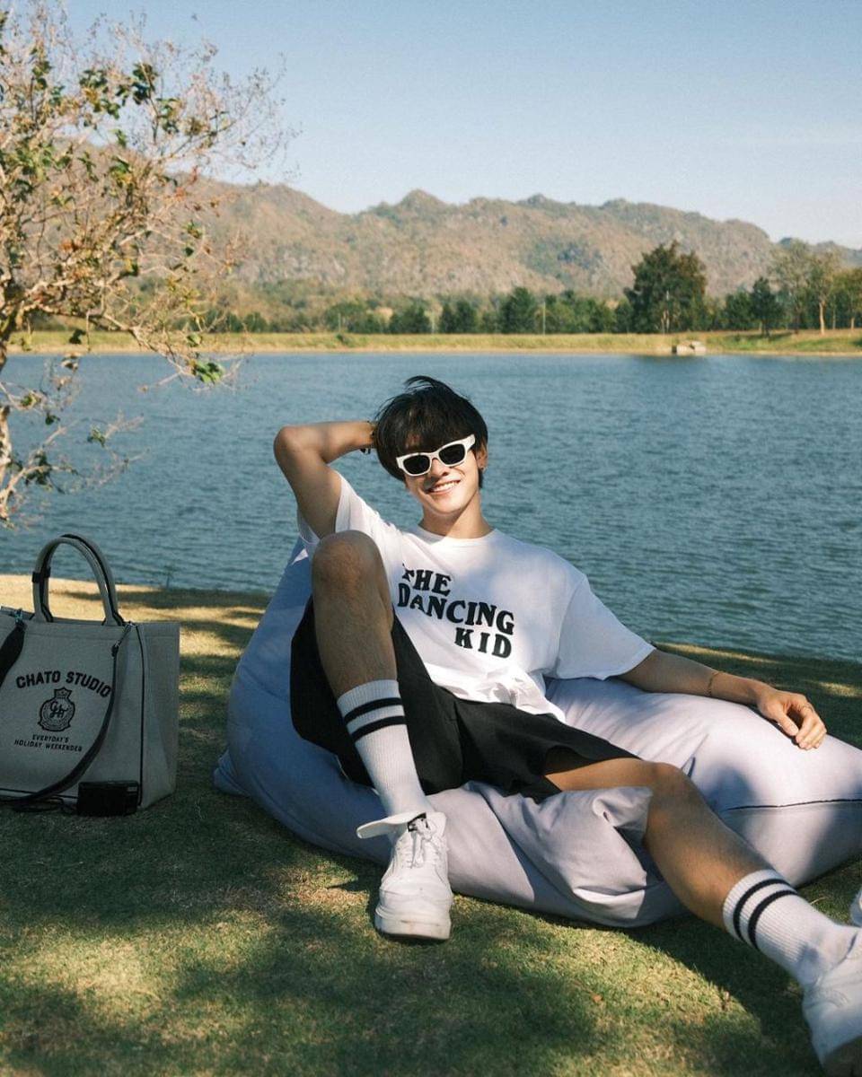 1. Pertama, Archen padankan basic outfit berupa printed tee putih dengan walkshort pants, sunglasses, dan white sneakers diberi socks