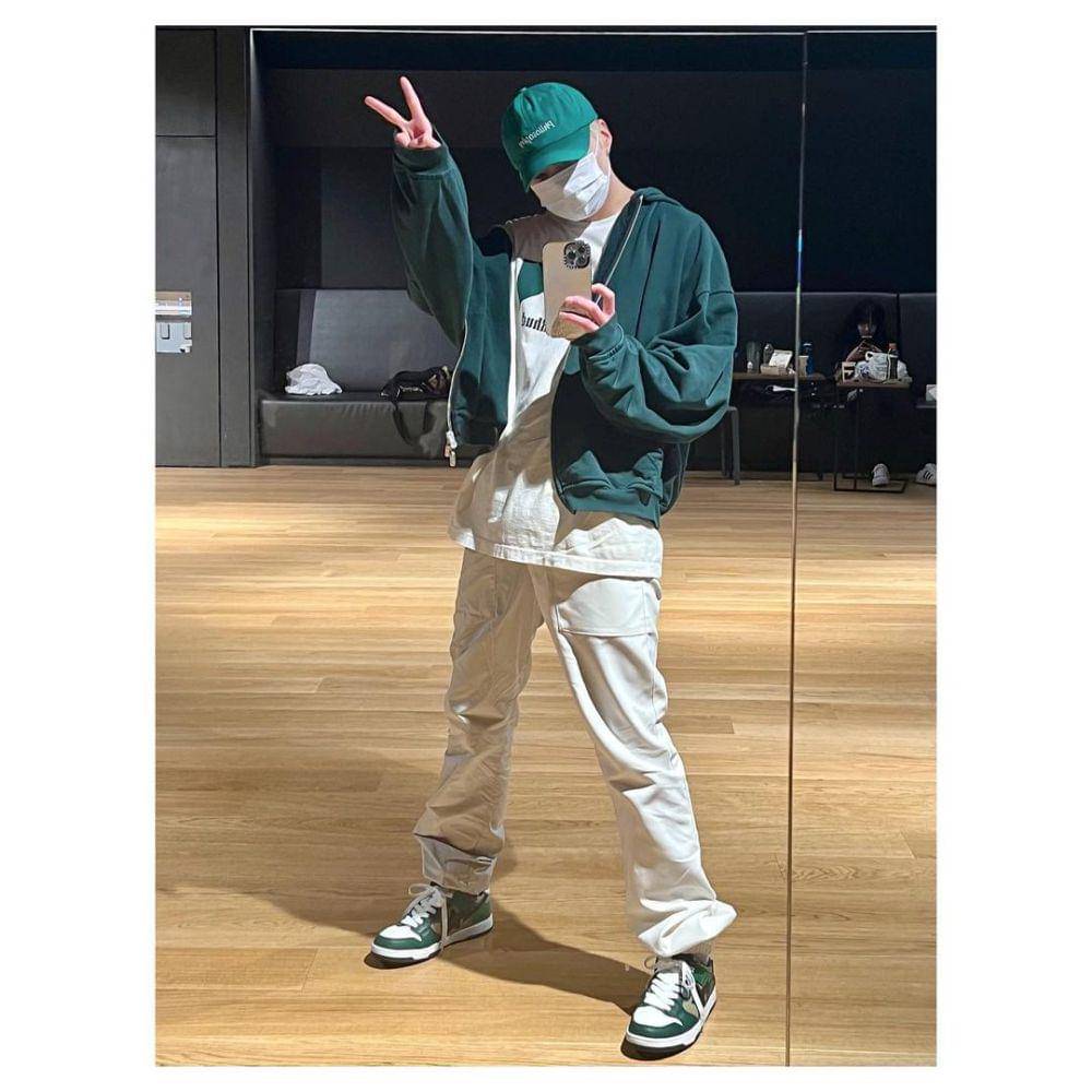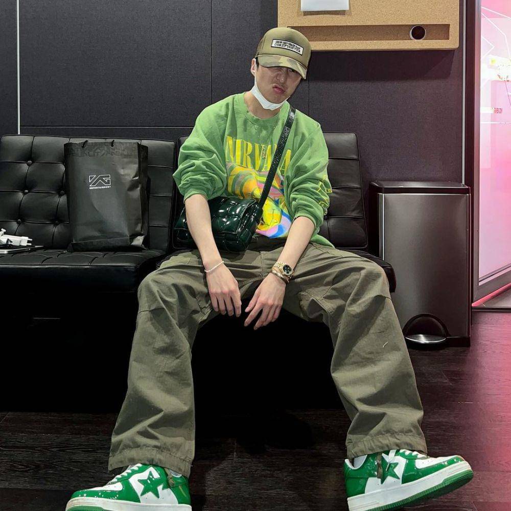 9. Padanan jogger pants putih, knit t-shirt hijau, bucket hat, dan boots bikin look jadi fresh. Biar makin memesona, pakai aksesori ala Seungyoon ini!