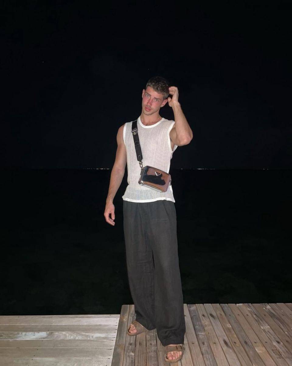 6. Simpel tetapi tetap bergaya dengan outfit musim panas yang terdiri dari padu padan sleeveless t-shirt, loose trousers, dan outdoor slippers