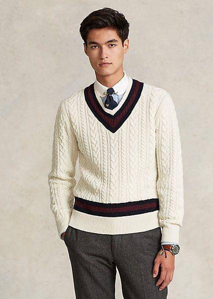 sweater kriket yang mempunyai ciri khas striped collar. Awalnya, sweater yang satu