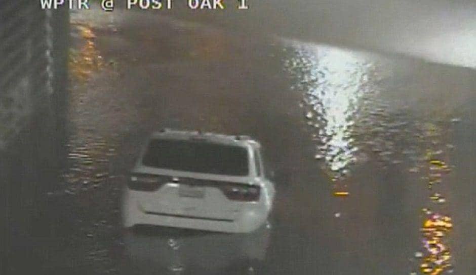 Dengan mobil SUV putih, Claudia melaju dengan kencang dan mencoba menerjang banjir.