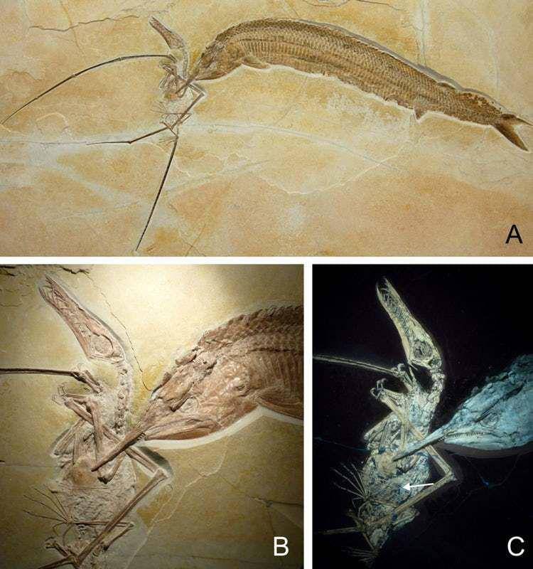 Fosil yang satu ini menggambarkan tentang adegan yang tidak biasa. Pterosaurus, reptil terbang yang masih sejenis dengan dinosaurus dan buaya sedang mencari mangsa seekor ikan tiba-tiba ditarik ke dalam air oleh Aspidorhynchus, yaitu jenis ikan dengan genus yang telah punah.