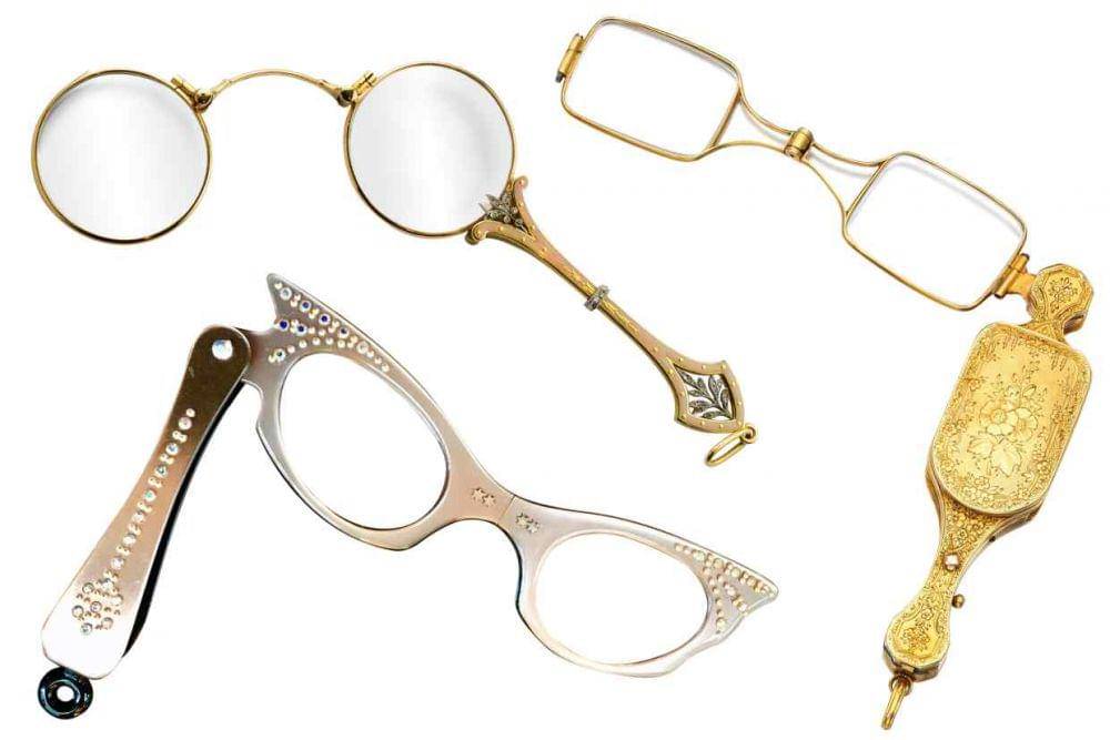 Lorgnettes berasal dari bahasa Perancis yaitu “ lorgner” Prancis. Lorgnettes adalah sepasang kacamata dengan pegangan yang digunakan untuk menahannya. Kacamata ini dipopulerkan oleh George Adams ketika ia merancang sebuah kasus singkat, designnya dipermudah agar bisa disimpan dalam saku. Pada abad ke-19, lorgnette biasa digunakan sebagai perhiasan. Berbanding terbalik dengan monocles yang banyak dipakai pria kelas atas, lorgnettes ini banyak disukai oleh wanita modis kelas atas.