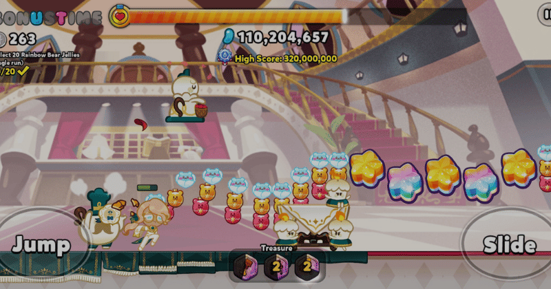 Treasure yang dikumpulkannya pun memiliki kemampuannya masing-masing: treasure ginseng memunculkan ginseng pelangi di udara; treasure skate mengaktifkan mode turbo dan menghasilkan jeli lilin; treasure Jellyco memanggil rudal yang meluluhlantakkan rintangan sekaligus menyisakan pecahan rudal Jellyco.