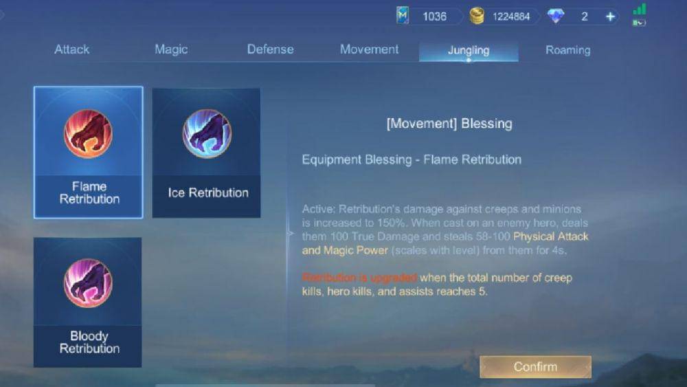 Flame Retribution memiliki efek untuk meningkatkan damage pada creeps dan minions sebesar 150 persen. Jika digunakan pada hero lawan, memberikan 100 True Damage dan mencuri 58-100 Physical Attack dan Magic Power. Sementara, Bloody Retribution dan Ice Retribution tidak cocok digunakan oleh Joy.