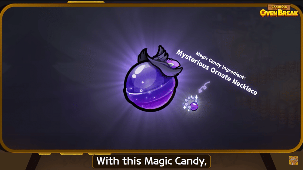 Untuk membuat magic candy, kamu perlu mencari ingredients atau bahan khusus yaitu Mysterious Ornate Necklace. Kamu bisa temukan bahan ini dengan cara menyelesaikan misi di trial Crowberry Cookie. Seperti biasa, Magic Candy ini baru bisa kamu bikin saat Crowberry Cookie sudah diupgrade minimal ke level 5.