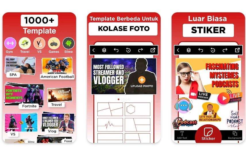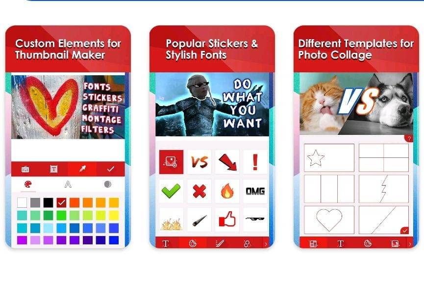Seperti namanya, aplikasi Pembuat Thumbnail Untuk YT didedikasikan untuk membantu kamu dalam membuat thumbnail video YouTube. Aplikasi yang pertama kali dirilis pada bulan September 2018 ini sudah diunduh lebih dari 10 juta kali dan mendapatkan rating 4,3 dari 171 ribu ulasan. Keunggulan aplikasi ini adalah menyediakan 50 gaya font berbeda, 1k background berbeda, dan 1k template berbeda.