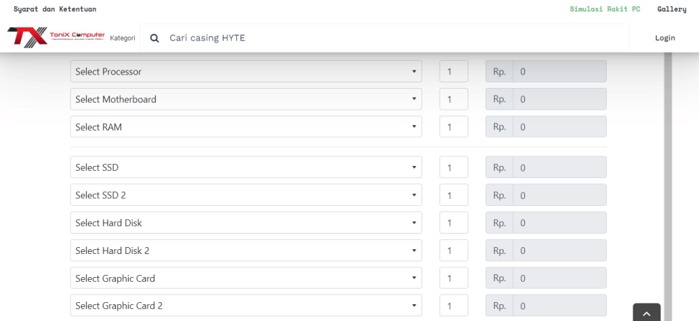 Toko peralatan komputer asal Surabaya ini punya website simulasi rakit PC yang cocok untuk awam. Lantaran tampilan website ini sangat simpel yang hanya menampilkan nama komponen dan masing-masing harganya. Website Win Computer cocok buat kamu yang ingin sekadar melihat total harga dari seluruh komponen yang dipilih.