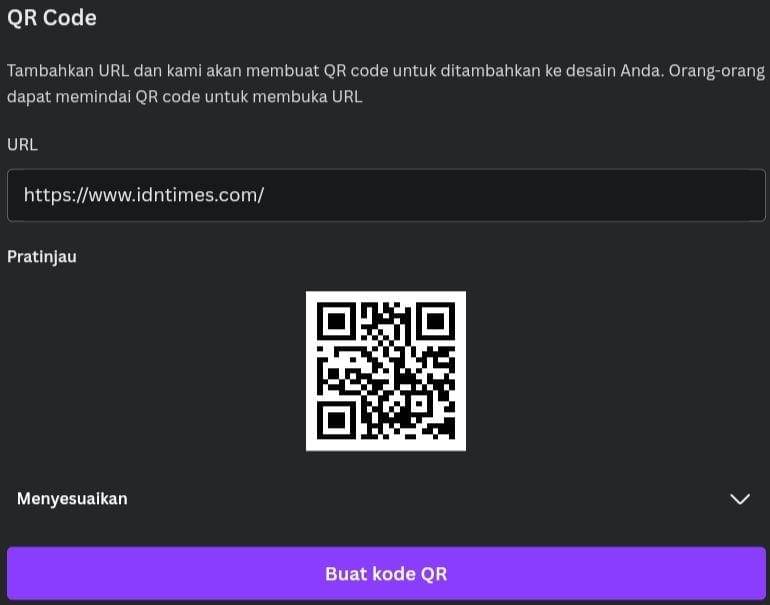 7. Klik Buat Kode QR. Kode QR akan secara otomatis ditambahkan pada desain kamu