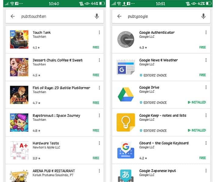 Play Store menawarkan cara untuk mencari seluruh aplikasi yang dikeluarkan oleh satu developer tertentu. Seperti cara di atas, kamu hanya perlu mengetikan pub:NamaDeveloper (misal: pub:Google) maka semua aplikasi yang diciptakan oleh developer tersebut akan muncul.