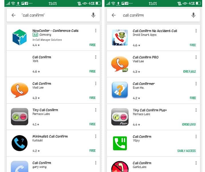 Menemukan nama aplikasi yang mirip selalu menjadi masalah. Cobalah untuk menambahkan tanda kutip pada setiap kata kunci yang dicari. Misalnya "call confirm", maka dengan begitu Play Store akan mengkhususkan nama untuk Call Confirm saja.