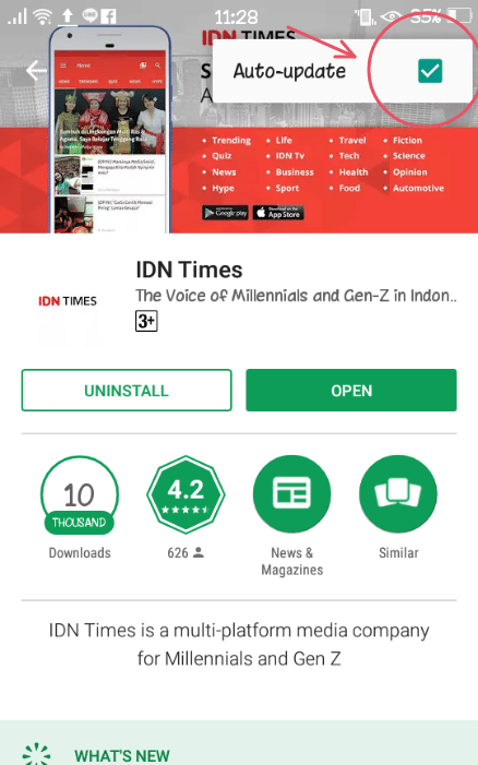 Cara untuk mengatasinya adalah dengan menuju aplikasi tersebut lalu tekan ikon tiga titik diatas kanan dan hilangkan centang pada kolom Auto-Update.