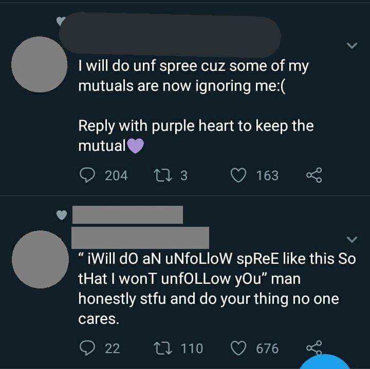 Kemudian mereka meminta follower membalas tweet tersebut agar tidak terkena unfollow. Tentunya ini sangat mengganggu pengguna lain, apalagi jika semua orang melakukannya. Ingatlah bahwa follower-mu adalah orang asli, bukan sekadar angka.
