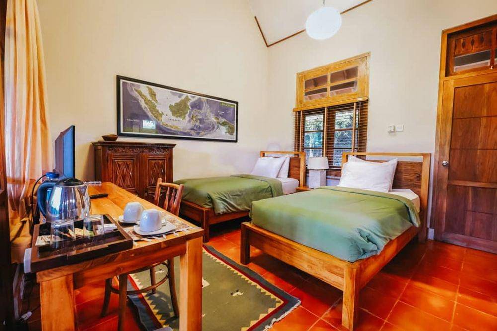 4. Kamar modern yang dipadukan dengan sentuhan tradisional tertata apik. Atmosfer yang cozy bikin para tamu merasa nyaman. Tersedia tipe Deluxe Room, Family Room, dan Private Villa