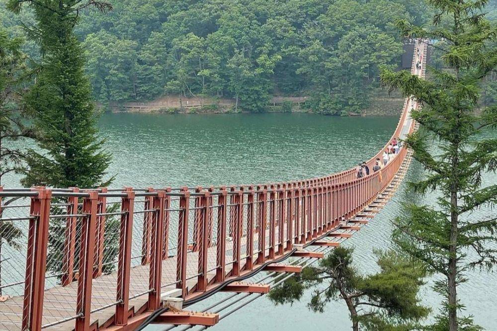 Menjadi landmark dari Danau Majang, yuk kita lihat indahnya menikmati pemandangan di Gisan-ri dengan melewati jembatan gantung. Bagaimana pesonanya? Mari kita lihat potretnya di bawah ini.