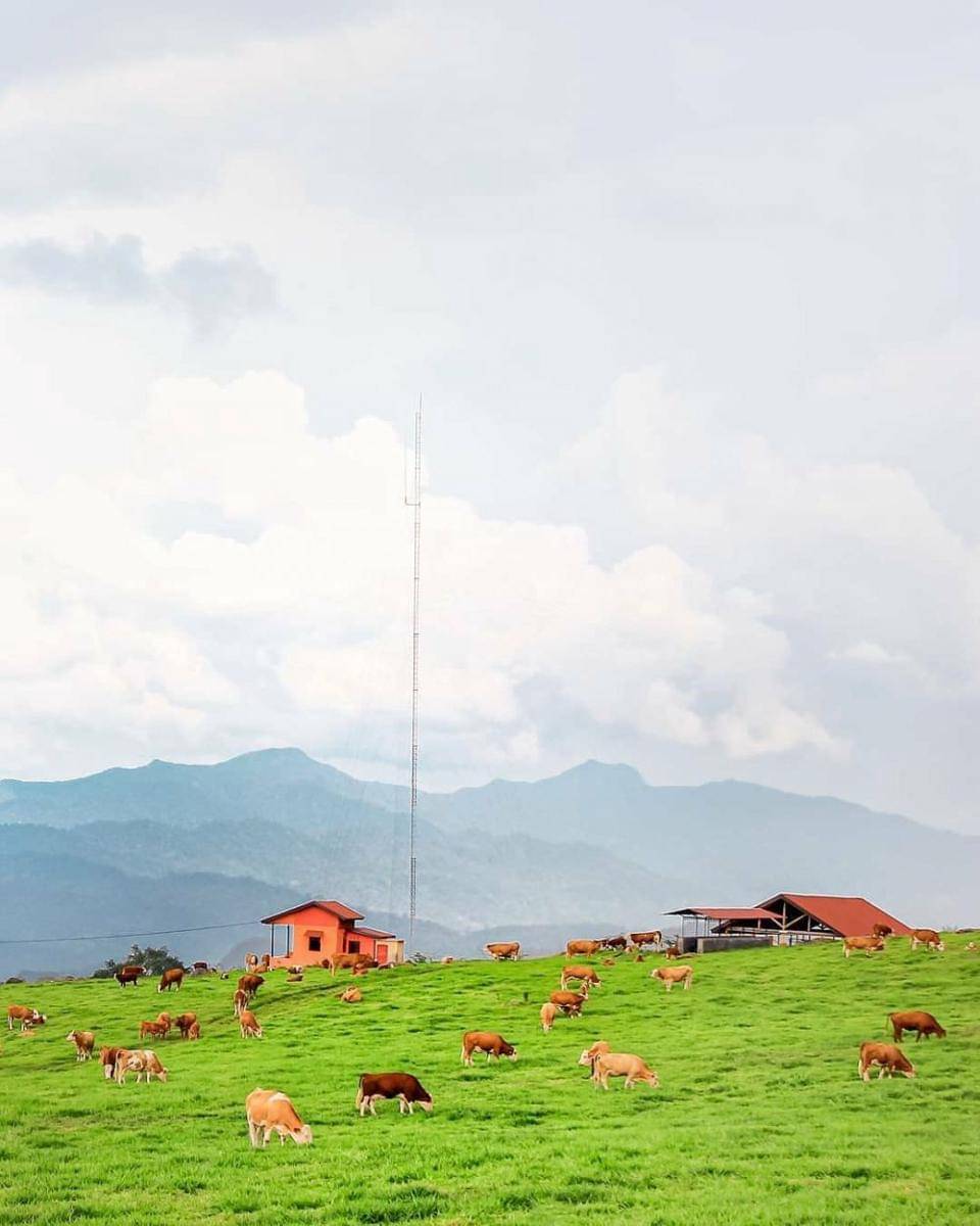 7. Padang Rumput Mangateh, Sumatra Barat, adalah sebuah kawasan peternakan yang asri. Banyak sapi bebas berkeliaran di sini, benar-benar serasa di New Zealand